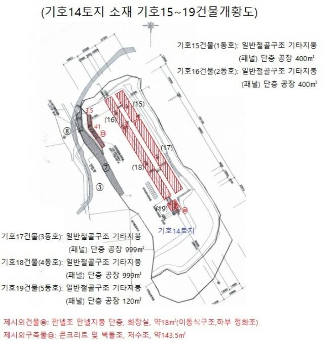 [128-6 1동호] * 공장용지 19935㎡ (6030.34평) 표준공시(㎡) 39,400 결정가(㎡) 78,000 결정가(평) 257,852 * 건물 공장 400㎡ (121평) 부속공장 12.5㎡ (3.78평) 소재불명 * 제시외 화장실 18㎡ (5.44평),포함 저수조 143.5㎡ (43.41평),포함 남측일부지상에골재등적치중 조경수포함 [2동호] * 건물 공장 400㎡ (121평) [3동호] 공장 999㎡ (302.2평) [4동호] 공장 999㎡ (302.2평) [5동호] 공장 120㎡ (36.3평) 현:사무실,창고,보일러실등 [산41-13] * 임야 20490㎡ (6198.22평) 표준공시(㎡) 1,350 결정가(㎡) 12,000 결정가(평) 39,670 입목포함 [127-3] * 전 731㎡ (221.13평) 현:휴경지,일부도로,구거 표준공시(㎡) 10,800 결정가(㎡) 27,000 결정가(평) 89,257 농취증필요(미제출시매수보증금몰수됨) [128-1] * 잡종지 2321㎡ (702.1평) 현:서측일부도로,농로 표준공시(㎡) 49,300 결정가(㎡) 81,000 결정가(평) 267,770 서측지상에석축(옹벽)포함 [128-3] * 잡종지 1654㎡ (500.34평) 현:서측일부도로,농로 표준공시(㎡) 49,300 결정가(㎡) 90,000 결정가(평) 297,522 [128-5] * 전 2115㎡ (639.79평) 현:휴경지,서측일부농로 표준공시(㎡) 10,800 결정가(㎡) 39,000 결정가(평) 128,926 * 제시외 창고 7.5㎡ (2.27평),제외 소유미상 제외 농취증필요(미제출시매수보증금몰수됨) [128-8] * 임야 1284㎡ (388.41평) 표준공시(㎡) 1,350 결정가(㎡) 15,000 결정가(평) 49,587 입목포함 [128-9] * 도로 871㎡ (263.48평) 표준공시(㎡) 39,400 결정가(㎡) 26,000 결정가(평) 85,951 [128-10] * 임야 15㎡ (4.54평) 현:도로 표준공시(㎡) 39,400 결정가(㎡) 26,000 결정가(평) 85,951 입목포함 [128-11] * 임야 4㎡ (1.21평) 현:도로 표준공시(㎡) 39,400 결정가(㎡) 26,000 결정가(평) 85,951 입목포함 [129] * 잡종지 992㎡ (300.08평) 표준공시(㎡) 49,300 결정가(㎡) 90,000 결정가(평) 297,522 [129-2] 1283㎡ (388.11평) 표준공시(㎡) 49,300 결정가(㎡) 90,000 결정가(평) 297,522 [129-3] * 전 2280㎡ (689.7평) 현:휴경지 표준공시(㎡) 10,800 결정가(㎡) 26,000 결정가(평) 85,951 * 제시외 창고 6.3㎡ (1.91평),제외 소유미상 제외 창고 10.5㎡ (3.18평),제외 소유미상 제외 농취증필요(미제출시매수보증금몰수됨) [산41-15] * 임야 4084㎡ (1235.41평) 현:일부도로,구거 표준공시(㎡) 1,350 결정가(㎡) 19,000 결정가(평) 62,810 * 제시외 화장실 18㎡ (5.44평),제외 저수조 143.5㎡ (43.41평),제외 입목포함 ............. 토지감정 2,623,919,000 건물감정 1,538,778,000 제시외 13,305,000 합계 4,176,002,000 보존등기 2020-07-02 |