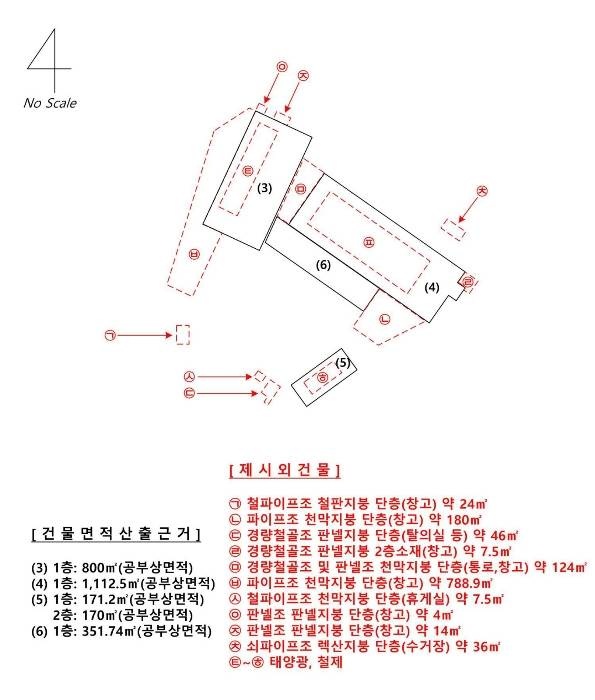 [361-11,신봉리 820-11 세원산업 가동호] * 건물 공장 800㎡ (242평) * 제시외 창고 24㎡ (7.26평),포함 창고 180㎡ (54.45평),포함 탈의실등 46㎡ (13.92평),포함 창고 7.5㎡ (2.27평),포함 통로,창고 124㎡ (37.51평),포함 창고 572.9㎡ (173.3평),포함 휴게실 7.5㎡ (2.27평),포함 창고 4㎡ (1.21평),포함 창고 14㎡ (4.23평),포함 수거장 36㎡ (10.89평),포함 옥탑태양광시설물3식(가,나,다동호)소재 ,제외 [나동호] * 건물 공장 1112.5㎡ (336.53평) [다동호] 1층 공장 171.2㎡ (51.79평) 현:사무실,식당,기숙사등 2층 공장 170㎡ (51.42평) 현:사무실,식당,기숙사등 [라동호] 공장 351.74㎡ (106.4평) [361-11] * 공장용지 7070㎡ (2138.67평) 표준공시(㎡) 200,500 결정가(㎡) 328,000 결정가(평) 1,084,302 [신봉리 820-11] 153㎡ (46.28평) 표준공시(㎡) 200,500 결정가(㎡) 328,000 결정가(평) 1,084,302 감정시점 2024-04-30 .......... 토지감정 2,369,144,000 건물감정 993,241,200 제시외 157,699,400 합계 3,520,084,600 보존등기 2004-12-21 |