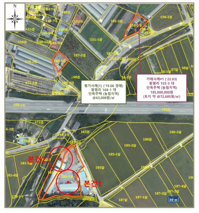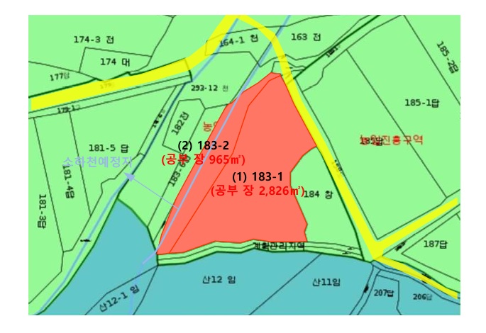 | -새터마을남측인근 -인근소규모공장,농촌마을,농경지,임야등형성 -인근에국도(3호선)및노선버스(정)소재 -대중교통사정보통 -2필일단의부정형등고평탄지 -동측노폭3m내외도로접함 농림지역 농업보호구역(2016-06-30) 가축사육제한구역(소·말·양·염소·사슴·젖소·메추리) <183-1> -경량철골조샌드위치판넬지붕 -난방설비 -소하천예정지(선당천)(183-2번지) <183-2> -소하천예정지(선당천) |