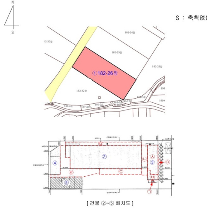 [182-26 에이동호] * 공장용지 6619㎡ (2002.25평) 표준공시(㎡) 57,100 결정가(㎡) 86,000 결정가(평) 284,299 * 건물 공장 1916.11㎡ (579.62평) * 제시외 출입구 7.5㎡ (2.27평),포함 통로 192㎡ (58.08평),포함 창고,작업장 270㎡ (81.68평),포함 창고,작업장 540㎡ (163.35평),포함 작업장등 240㎡ (72.6평),포함 옥탑 계단실 95㎡ (28.74평),포함 차양 300㎡ (90.75평),포함 창고 21㎡ (6.35평),포함 태양광발전설비1식,제외 * 기타 수전설비1식 [비동호] * 건물 1층 사무실 231.72㎡ (70.1평) 1층 식당 165.64㎡ (50.11평) 2층 기숙사 397.36㎡ (120.2평) 지하 보일러실 94.73㎡ (28.66평) [씨동호] 창고 284.24㎡ (85.98평) [디동호] 공장 396㎡ (119.79평) ............ 토지감정 569,234,000 건물감정 995,592,010 제시외 230,550,000 기타 15,000,000 합계 1,810,376,010 |