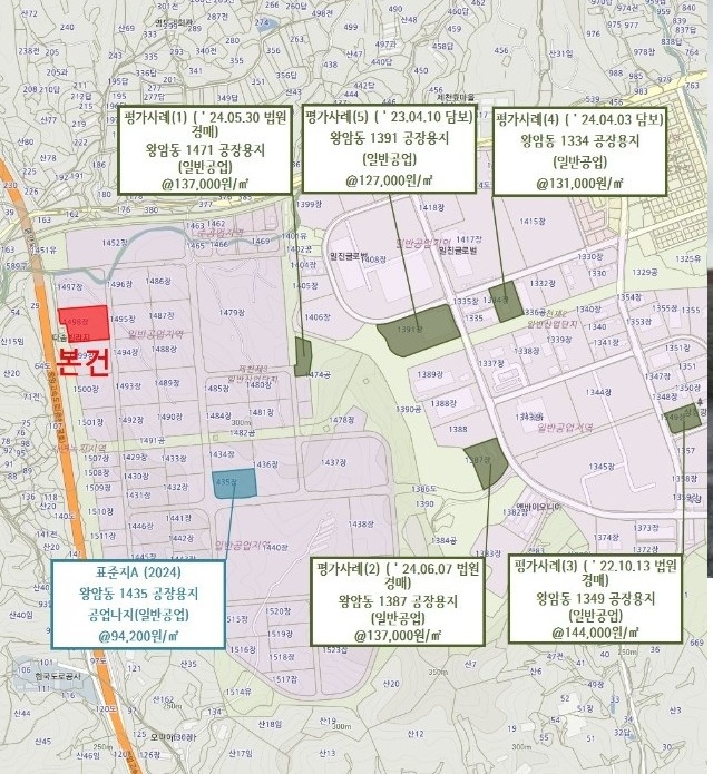 | -중로2류(폭15m~20m)(접합) -일반산업단지(제3산업단지) -제천제3일반산업단지내위치 -주위공장형성 -인근에간선도로소재 -제반교통사정양호 -사다리형평지 -동측노폭약15m내외도로접함 도시지역 일반공업지역 자연녹지지역 준보전산지 가축사육제한구역(전부제한지역) 중점경관관리구역(한방·산업벨트) <주1동> -일반철골구조기타지붕(패널) -2024.6.27.자로건축물대장면적이변경되었고,건축물대장상면적을기준으로평가함 -시스템에어컨설비 <주2동> -일반철골조기타지붕(패널) |