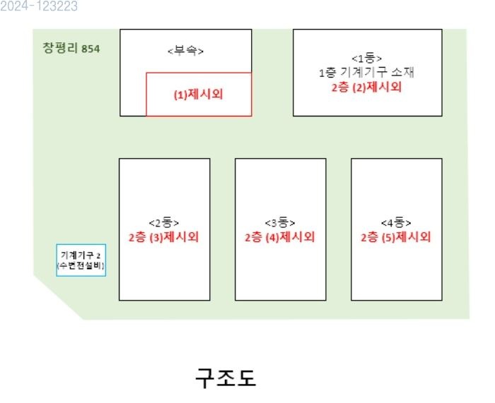 [1동] * 공장용지 2054.6㎡ (621.52평) 표준공시(㎡) 136,900 결정가(㎡) 217,000 결정가(평) 717,359 * 건물 공장 198.72㎡ (60.11평) 부속1층공장 21.44㎡ (6.49평) 부속2층공장 177.12㎡ (53.58평) * 제시외 2층 공장 198.72㎡ (60.11평),포함 1층 사무실 155.68㎡ (47.09평),포함 * 기계 기계기구3식소재 야외수도및옹벽등포함 [2동] * 건물 공장 196㎡ (59.29평) * 제시외 2층 공장 196㎡ (59.29평),포함 [3동] * 건물 공장 196㎡ (59.29평) * 제시외 2층 공장 196㎡ (59.29평),포함 [4동] * 건물 공장 196㎡ (59.29평) * 제시외 2층 공장 196㎡ (59.29평),포함 .......... 토지감정 445,848,200 건물감정 727,656,960 제시외 729,997,920 기계감정 421,500,000 합계 2,325,003,080 보존등기 2021-03-26 |