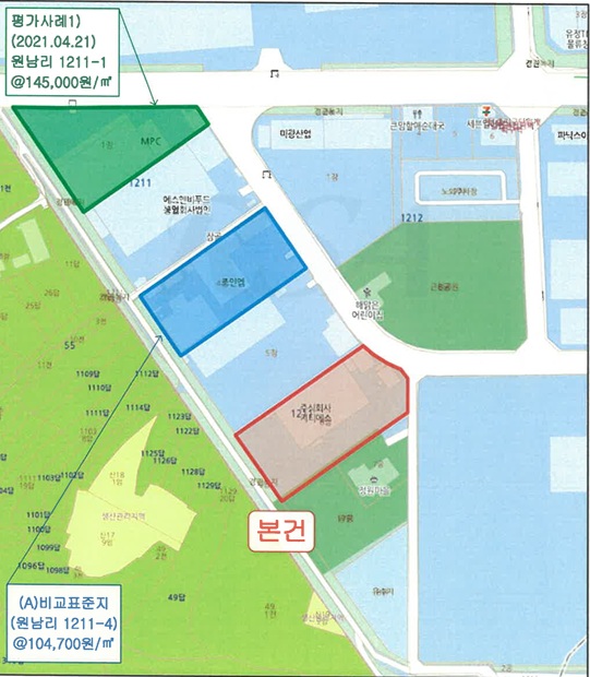 [주1동] * 공장용지 5949.5㎡ (1799.72평) 표준공시(㎡) 104,700 결정가(㎡) 154,000 결정가(평) 509,093 ㎡ 결정가(㎡) 145,000 결정가(평) 479,341 * 건물 기타공장 1880.3㎡ (568.79평) 부속창고 190㎡ (57.48평) 부속사무실 90.04㎡ (27.24평) 부속사무실 48.01㎡ (14.52평) 부속사무실 133.65㎡ (40.43평) * 제시외 차양 57㎡ (17.24평),포함 현관 3.3㎡ (1평),포함 기계실 12㎡ (3.63평),포함 청소함 1.1㎡ (0.33평),포함 기계실 3㎡ (0.91평),포함 창고 300㎡ (90.75평),제외 타인소유 제외 창고 110㎡ (33.28평),제외 타인소유 제외 * 기계 기계기구소재-일부소재불명 관정1식소재 법정지상권성립여부불분명 수목포함 **타인소유건물감안가격임 [주건축물 2동] * 건물 1층 공장 795.6㎡ (240.67평) 2층 공장 596.7㎡ (180.5평) **2025.8월 제시외청소함,기계실 추가되면서 재감정 ........... 토지감정 862,677,500 건물감정 2,235,127,300 제시외 12,861,000 기계감정 2,549,000,000 기타 12,000,000 합계 5,671,665,800 보존등기 2012-07-03 |