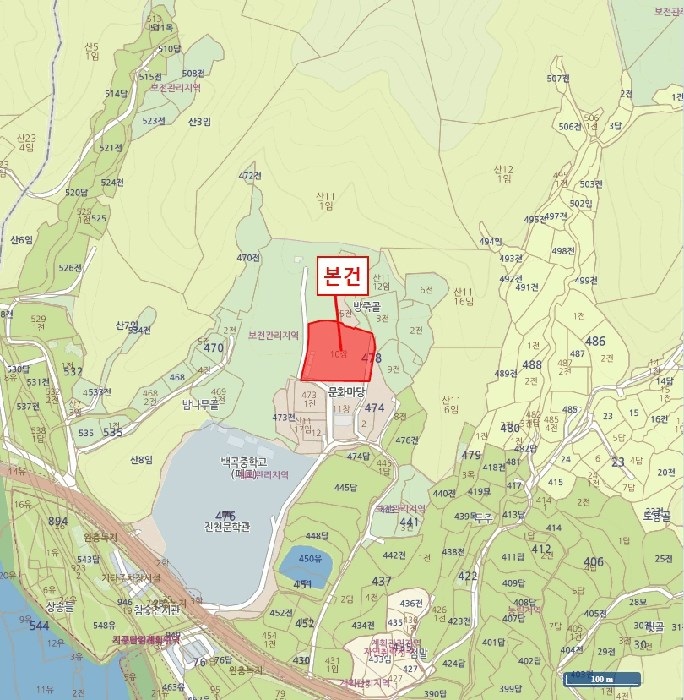 | -파이프조조립식판넬지붕 -참숯전시관북동측인근 -주위단독주택,근린시설,농경지및자연림등혼재 -버스(정)인근소재 -교통사정무난 -사다리완경사지 -지적도상맹지,진출입가능여부는재확인바람 계획관리지역 공장설립제한지역(2012-11-23) 중점경관관리구역(2022-05-11)(백곡호중점경관관리구역) 성장관리계획구역(2024-04-19)(관리형) 가축사육제한구역(2025-06-27)(일부제한구역700m) |