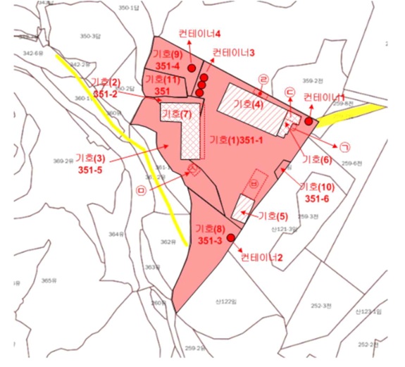 [351-1,351-2,351-5 가동] * 건물 공장 1632㎡ (493.68평) * 기계 기계기구5식소재-일부소재불명 [나동] * 건물 공장 244㎡ (73.81평) [다동] 1층 식당,휴게실 227.88㎡ (68.93평) 2층 사무실 227.88㎡ (68.93평) 3층 기숙사 227.88㎡ (68.93평) [라동] 1층 공장 1305.5㎡ (394.91평) 2층 공장 619.5㎡ (187.4평) 2층 공장 318.6㎡ (96.38평) 2층 물탱크실 42㎡ (12.7평) [351-1] * 공장용지 8527㎡ (2579.42평) 표준공시(㎡) 126,600 결정가(㎡) 209,000 결정가(평) 690,912 * 제시외 차양 8㎡ (2.42평),포함 계단실,옥상창고 219.5㎡ (66.4평),포함 물탱크실 58.3㎡ (17.64평),포함 창고 52㎡ (15.73평),포함 차양 132.5㎡ (40.08평),포함 작업장 414.8㎡ (125.48평),포함 입찰외제시외컨테이너소재 [351-2] * 공장용지 591㎡ (178.78평) 표준공시(㎡) 126,600 결정가(㎡) 209,000 결정가(평) 690,912 [351-5] 2195㎡ (663.99평) 표준공시(㎡) 126,600 결정가(㎡) 209,000 결정가(평) 690,912 * 제시외 창고 17.7㎡ (5.35평),포함 지붕없음 포함 입찰외제시외컨테이너소재 [351-3] * 임야 2500㎡ (756.25평) 표준공시(㎡) 6,830 결정가(㎡) 39,000 결정가(평) 128,926 입찰외제시외컨테이너소재 [351-4] * 임야 1164㎡ (352.11평) 현:공장부지의부속토지 표준공시(㎡) 126,600 결정가(㎡) 95,000 결정가(평) 314,051 입찰외제시외컨테이너소재 [351-6] * 임야 97㎡ (29.34평) 현:공장부지의부속토지 표준공시(㎡) 126,600 결정가(㎡) 92,000 결정가(평) 304,134 [351] * 전 734㎡ (222.04평) 현:공장부지의부속토지 표준공시(㎡) 126,600 결정가(㎡) 71,000 결정가(평) 234,712 농취증필요(미제출시보증금몰수,사실조회회신참조) ............. 토지감정 2,633,535,000 건물감정 2,502,135,400 제시외 110,794,000 기계감정 159,000,000 합계 5,405,464,400 |