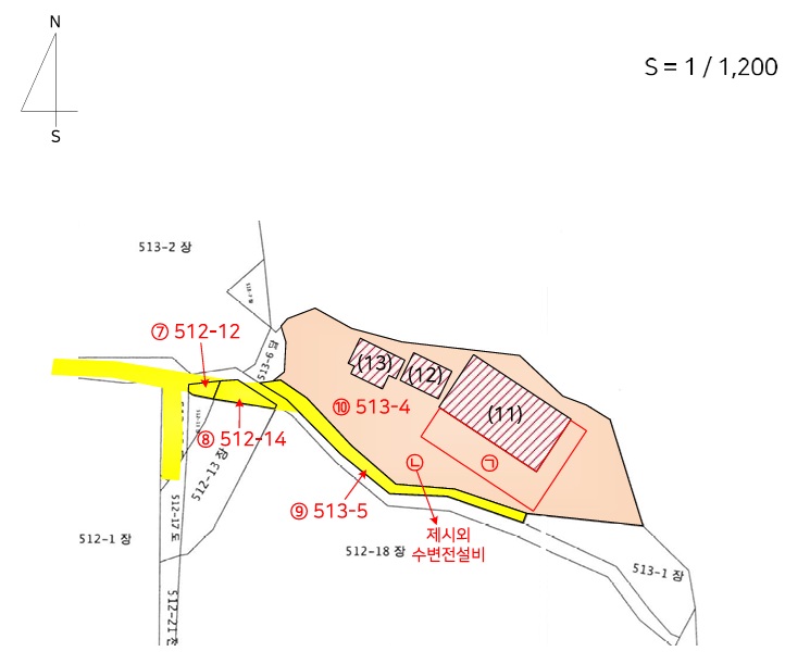 [512-18,512-11,512-13,513-1 가동호] * 건물 1층 공장 552.8㎡ (167.22평) 2층 사무실 164.05㎡ (49.63평) [나동호] 창고(냉동창고) 387.53㎡ (117.23평) * 제시외 차양 75㎡ (22.69평),포함 냉동설비포함 [513-1] * 공장용지 543㎡ (164.26평) 표준공시(㎡) 133,000 결정가(㎡) 116,000 결정가(평) 383,473 * 수목 조경수식재(513-1,512-11,-13,-18지상) [512-11] * 공장용지 52㎡ (15.73평) 표준공시(㎡) 133,000 결정가(㎡) 116,000 결정가(평) 383,473 [512-13] 531㎡ (160.63평) 표준공시(㎡) 133,000 결정가(㎡) 116,000 결정가(평) 383,473 * 기타 수전변설비1식소재 [512-18] * 공장용지 5499㎡ (1663.45평) 표준공시(㎡) 75,000 결정가(㎡) 116,000 결정가(평) 383,473 * 제시외 차양 29㎡ (8.77평),포함 입찰외컨테이너소재 [512-12] * 도로 27㎡ (8.17평) 표준공시(㎡) 133,000 결정가(㎡) 46,000 결정가(평) 152,067 [512-14] 67㎡ (20.27평) 표준공시(㎡) 133,000 결정가(㎡) 46,000 결정가(평) 152,067 [513-5] 242㎡ (73.2평) 표준공시(㎡) 133,000 결정가(㎡) 46,000 결정가(평) 152,067 [513-4 가동호] * 공장용지 3063㎡ (926.56평) 표준공시(㎡) 133,000 결정가(㎡) 141,000 결정가(평) 466,118 * 건물 공장 494.7㎡ (149.65평) * 제시외 차양 395㎡ (119.49평),포함 * 기타 수변전설비1식소재 [513-4 나동호] * 건물 사무실 88㎡ (26.62평) 현:숙소등 [513-4 다동호] 숙소 108.39㎡ (32.79평) **2025.10월 감정가조정 ............. 토지감정 1,215,839,000 건물감정 1,046,399,100 제시외 51,230,000 수목감정 2,800,000 기타 26,700,000 합계 2,342,968,100 보존등기 2014-02-25 |