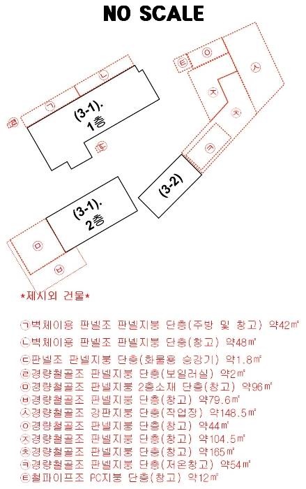 [369-5] * 공장용지 1396㎡ (422.29평) 표준공시(㎡) 56,400 결정가(㎡) 151,000 결정가(평) 499,176 * 건물 1층 창고,주택 341.17㎡ (103.2평) 2층 기타공장 190.62㎡ (57.66평) 부속건조장 105㎡ (31.76평) * 제시외 주방,창고 42㎡ (12.7평),포함 창고 48㎡ (14.52평),포함 화물용승강기 1.8㎡ (0.54평),포함 보일러실 2㎡ (0.6평),포함 창고 96㎡ (29.04평),포함 창고 79.6㎡ (24.08평),포함 창고 12㎡ (3.63평),포함 * 수목 주목나무외약20여주식재 바닥포장,조경석포함 입찰외기계기구(소재불명)소재 [369-6] * 답 639㎡ (193.3평) 현:396-5번지부속토지,잡종지 표준공시(㎡) 56,400 결정가(㎡) 122,000 결정가(평) 403,308 * 제시외 작업장 148.5㎡ (44.92평),포함 창고 44㎡ (13.31평),포함 창고 104.5㎡ (31.61평),포함 창고 165㎡ (49.91평),포함 저온창고 54㎡ (16.34평),포함 농취증필요(미제출시매수보증금미반환,원상회복명령발하여질가능성있음) ........... 토지감정 288,754,000 건물감정 326,188,280 제시외 100,128,000 수목감정 2,000,000 합계 717,070,280 보존등기 2005-11-04 |