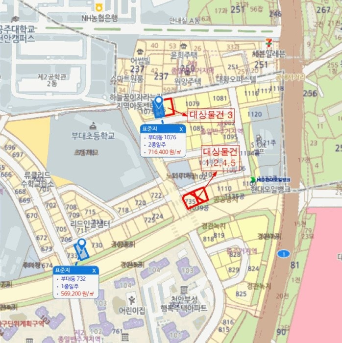 | -부대초등교동측인근 -북측공주대학교천안공과대학,주위근린상가및주택,아파트단지소재,나지많은정비된주거지대 -동측인근1번국도지나며서측근거리향후부대역개설예정 -시내버스인근운행 -제반교통여건무난 제1종일반주거지역 준보전산지 중점경관관리구역 상대보호구역(2024-02-01)(천안부대초) 상대보호구역(공주대학교천안캠퍼스상대보호구역) 지구단위계획구역(부성지구) 도시지역(천안도시지역) 가축사육제한구역(타법에의한전부제한구역) <735> -1114번지와일단지 -가각정리된사각형평지 -서측대로,북측소로접함 -대로3류(폭25m~30m)(부성지구)(접합) -소로2류(폭8m~10m)(부성지구)(접합) <736> -1113번지와일단지 -직사각형평지 -서측대로,북측소로접함 <1113> -직사각형평지 -북측소로접함 -소로2류(폭8m~10m)(부성지구)(접합) <1114> -가각정리된사각형평지 -북측소로접함 -소로2류(폭8m~10m)(부성지구)(접합) |