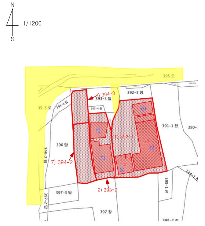 | -은포교차로남동측인근 -주위주택,농경지,공장용지등혼재 -본건및인근까지차량접근가능 -주위버스(정)소재 -제반교통상황보통 -부정형평지 -지적도상맹지이며북측약4m도로통해진출입 농림지역 농업진흥구역 가축사육제한구역(일부제한모든축종제한) <주1동> -철콘및철골구조슬래브및판넬지붕 <주2동> -일반철골구조판넬지붕 <393-1 주3동> -일반철골구조철판지붕 <393-1 주4동> -일반철골구조판넬지붕 <392-1> -393-2번지와일단지 |